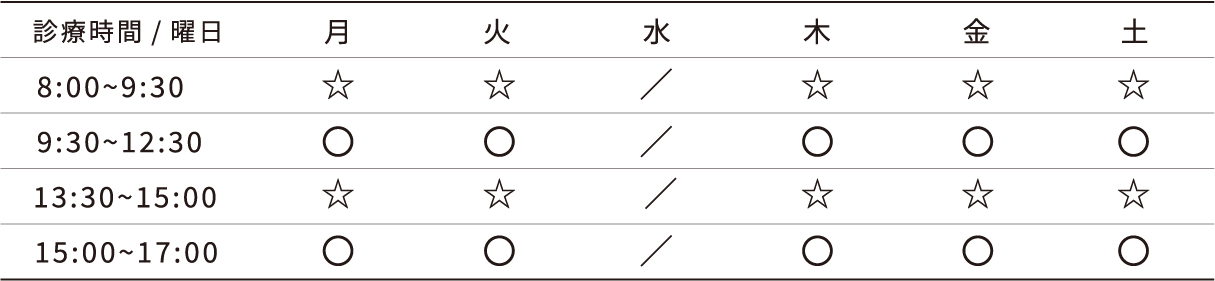 ※午前の最終受付は12:00、夕方の最終受付は17:00、土曜日の最終受付は16: 00です